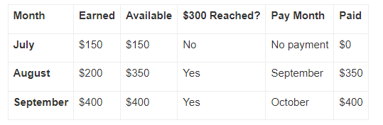 → July: You earned $150 but didn't reach $300, so no payment.